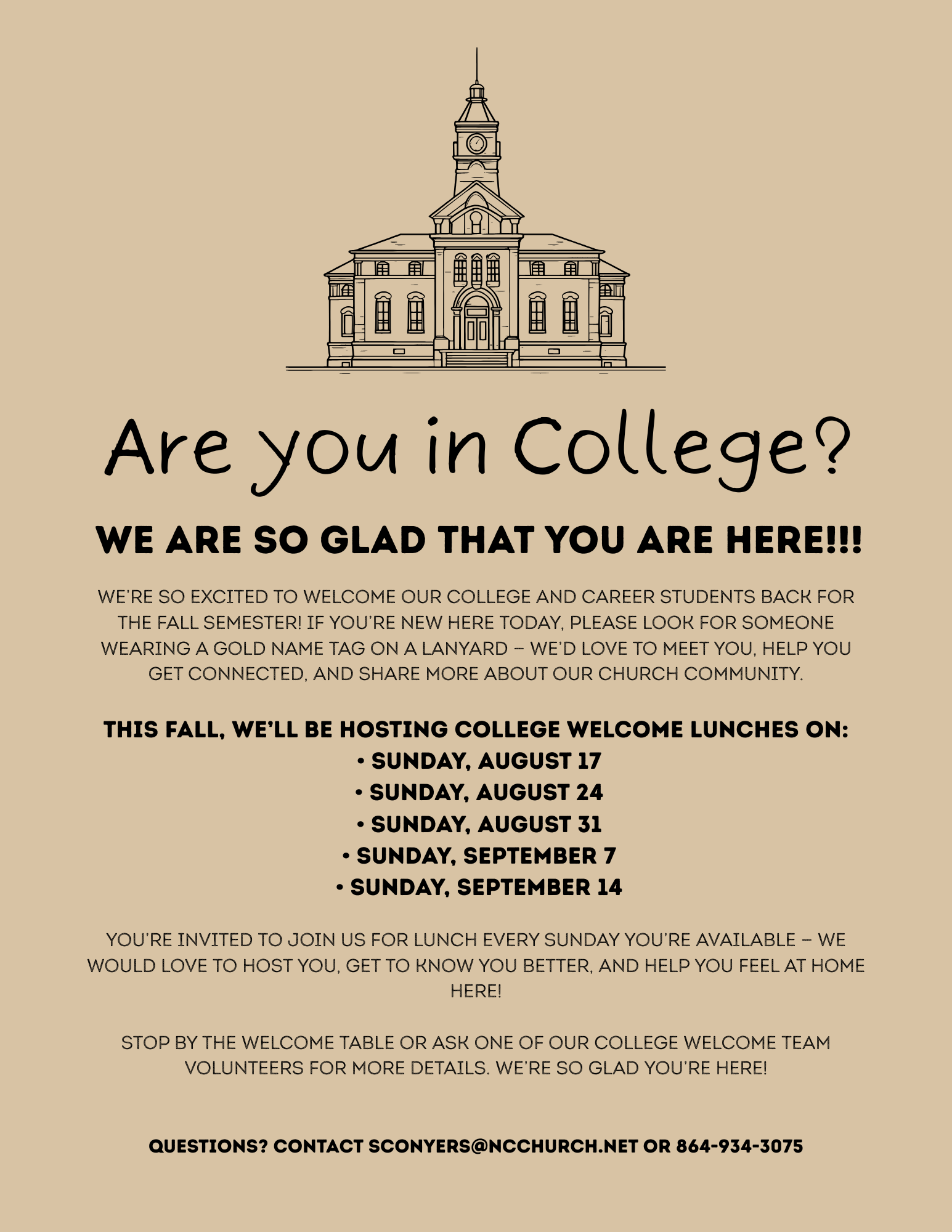 Throughout the year the co-eds are invited to a member’s home for food and fellowship after church, to College Cookie Breaks, and various other fun stuff - join our “New covenant college ministry” GroupMe for updates. Email Youth and Family Life Ministry Coordinator Leila Sconyers